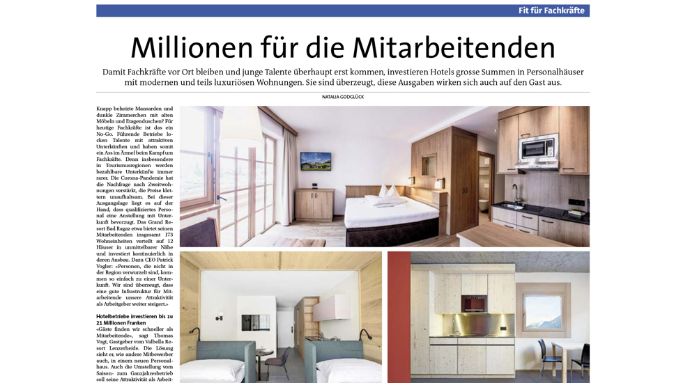 Damit Fachkräfte vor Ort bleiben und junge Talente überhaupt erst kommen, investieren Hotels grosse Summen in Personalhäuser mit modernen und teils luxuriösen Wohnungen. Sie sind überzeugt, diese Ausgaben wirken sich auch auf den Gast aus.